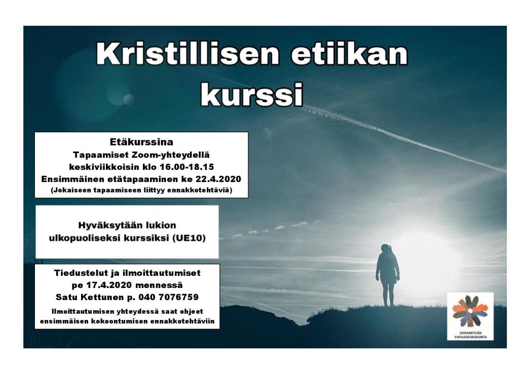 Kristillisen etiikan kurssilla käsitellään etiikkaan ja moraaliin liittyviä peruskäsitteitä sekä kristillisen etiikan keskeisiä ajatuksia. Kurssiin sisältyy keskustelua eettisistä kysymyksistä, erilaisten mediasisältöjen arviointia kristillisen etiikan näkökulmasta sekä oman elämän arvojen ja valintojen pohtimista.