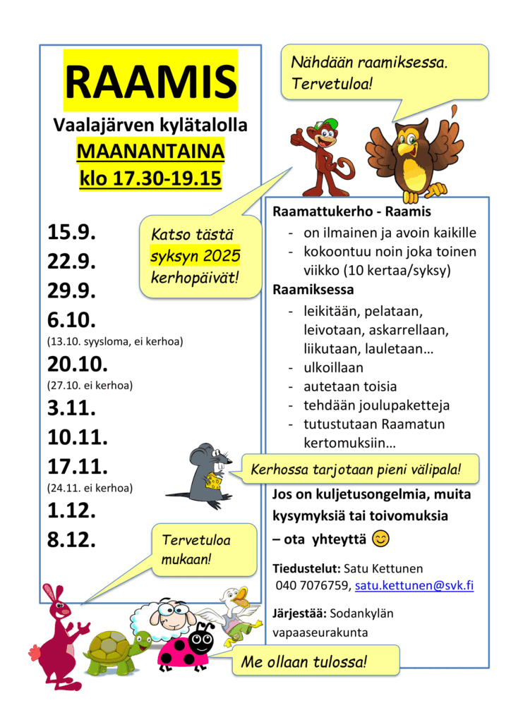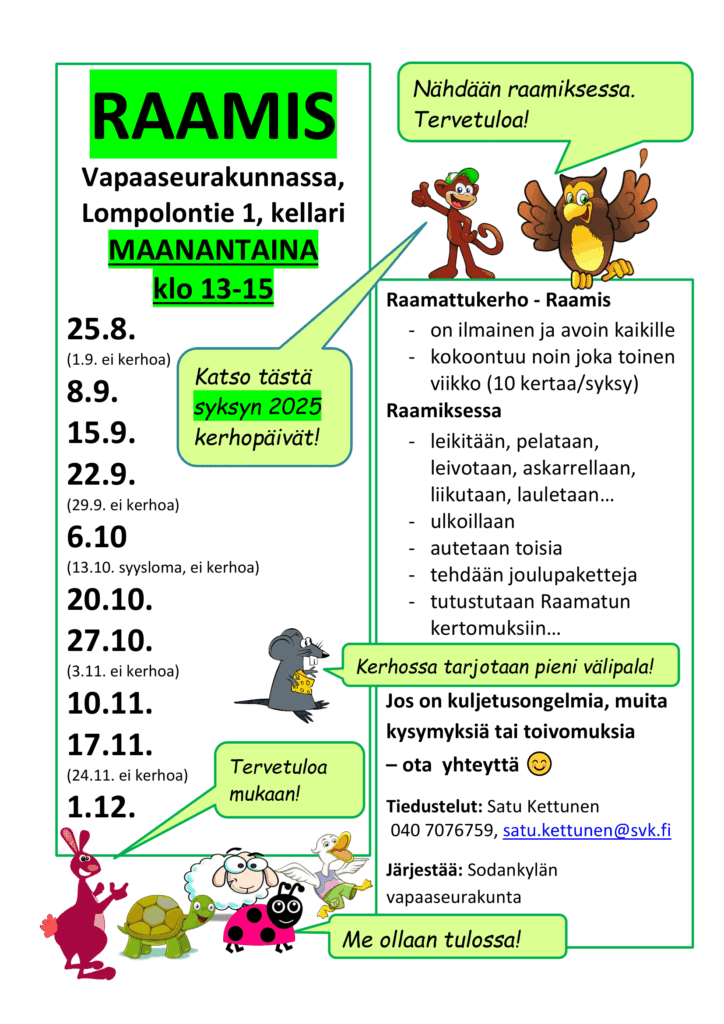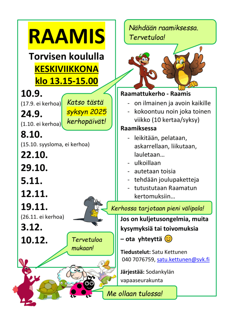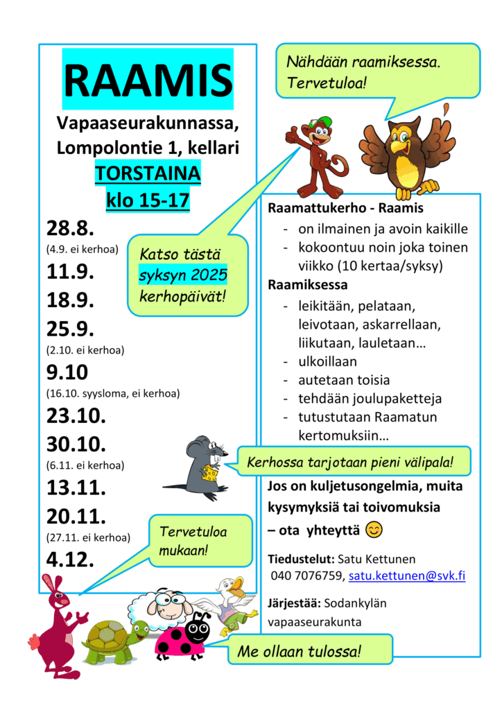 Raamattukerhojen aikataulut syksy 2025 Kaikille avoimet Raamattukerhot alakouluikäisille syksyllä 2025 vapaaseurakunnassa, Lompolontie 1, Torvisen koululla ja Vaalajärven kylätalolla.