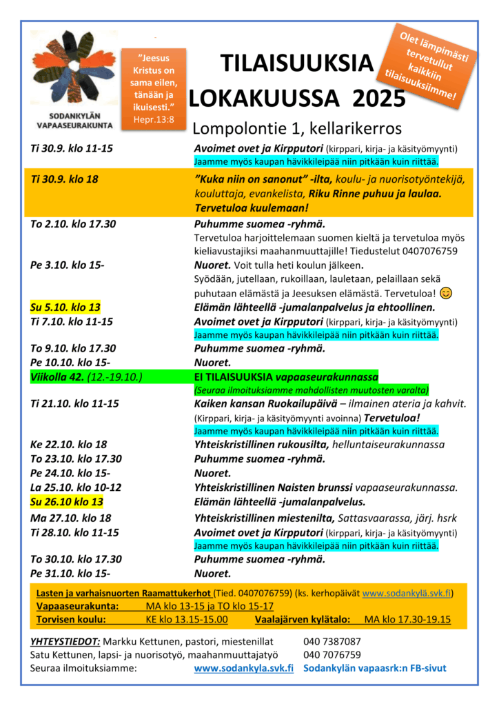 Ajankohtaista Kuukausitiedote Vapispuoti – kirppis ja kirjamyynti – avoinna Tiistaisin klo 11-15 ja tilaisuuksien yhteydessä.Tiedustelut ja lahjoitusten vastaanotosta sopiminen p. 040 7076759 Raamattukerhojen aikataulut syksy 2025. Toimintakalenteri
